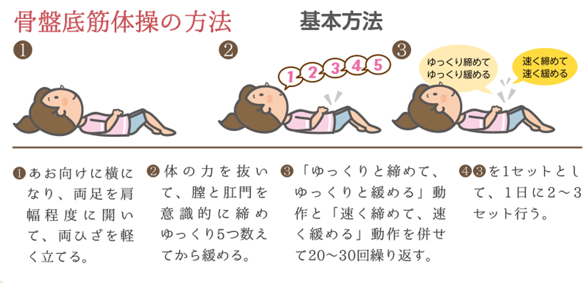 骨盤の底で膀胱や尿道、子宮や直腸などを支える骨盤底筋を鍛え、尿道を締める力を強くするための体操です。骨盤底筋を意識しながら、膣や肛門を繰り返し締めたり、緩めたりします。