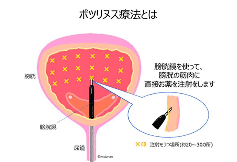 - ボツリヌス菌がつくる天然のたんぱく質「ボツリヌストキシン」を膀胱の筋 肉に直接注射します。ボツリヌス菌を注射するわけではありませんので、ボツリヌス菌に感染する心配はありません。